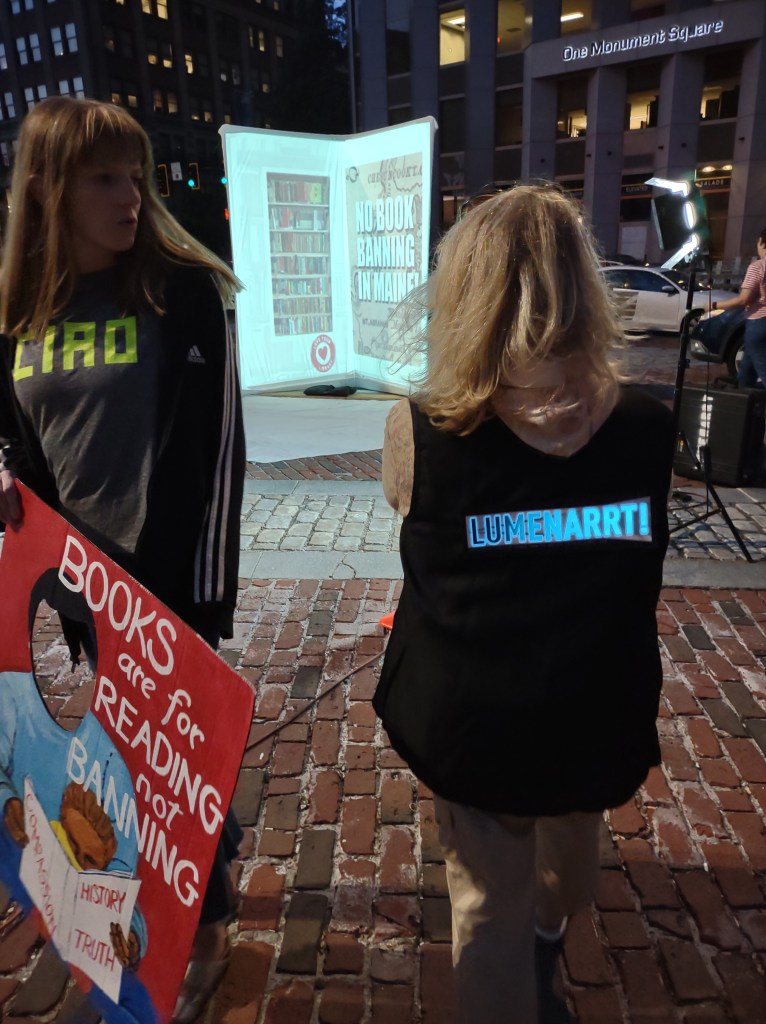 We were pleased to join with the Maine Library Association — on First Friday Art Walk in Monument Square — to project in support of the freedom to read. The librarians passed out lots of good info, people took selfies, and LumenARRT! even had a screen in the shape of a book. Click here to see our video of the event!