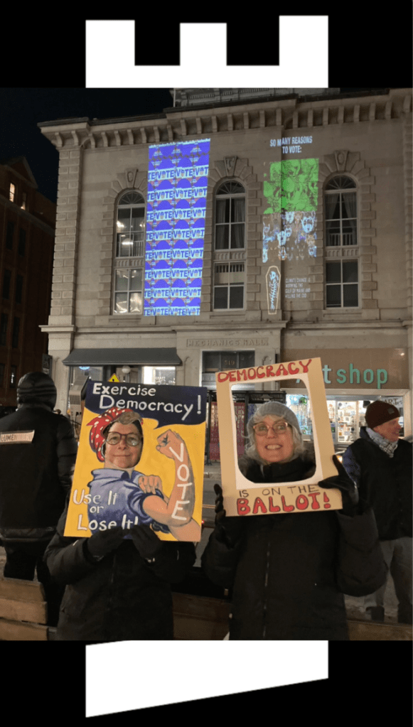 Great turn-out! Voters registered and so many fun selfies were taken! We did voting projections on Mechanics’ Hall in October and November and rocked to the sounds of the Ideal Maine Social Aid and Sanctuary Band. Passers-by got cool stickers and lots of selfie props for getting the best pic — and our partners The League of Women Voters of Maine answered voting questions! Here’s a taste of what it was like (a video of our projection last March).