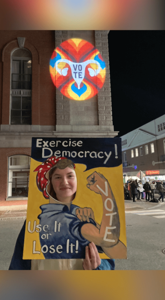 LumenARRT! was busy last year supporting voting and abortion rights. One super effort was before the election, when we projected on Mechanics’ Hall on Congress St. in Portland. We had a camera set-up so that passers-by could hold up signs and see themselves projected on the building! Lots of proud voters and feminists took part! Click on picture or view video here!