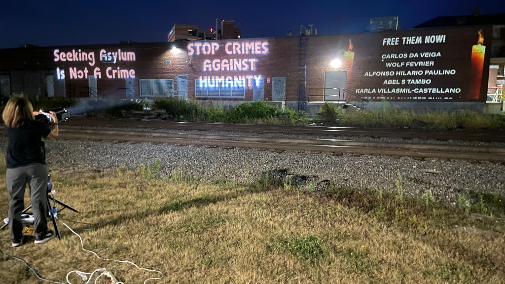 At Congress Square Park, Portland, our recent projection, Detention Center in a Truck, called attention to the new ICE office and holding cell at One City Center and asked for an end to profiling and deportations of people of color in Maine. #EVICTICE #ABOLISHICE